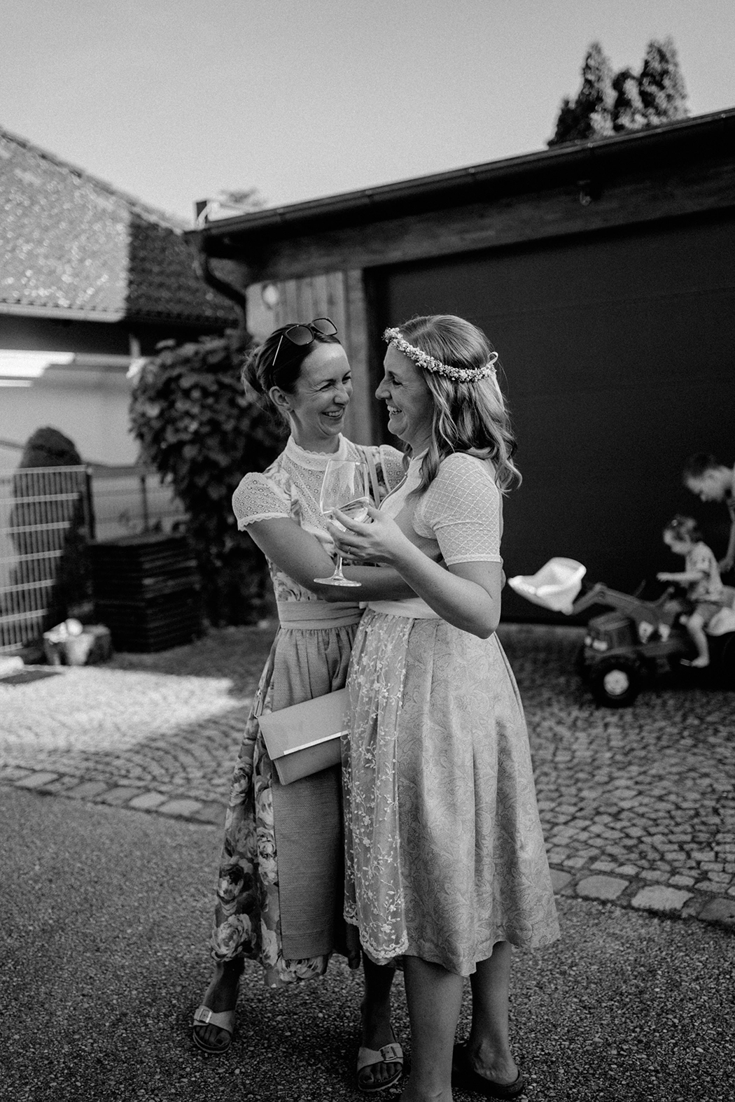 Die Trauung kann ich mit zwei Wörtern beschreiben – emotional und herzerwärmend. Der Einzug wurde von den beiden Jungs des Brautpaares angeführt. Hand in Hand gingen die Zwei mit den Mädls der Trauzeugin und besten Freundin der Braut in den Trauungssaal. Während das Brautpaar den Gang entlang schritt, spielte der Neffe auf seiner steirischen Quetschn. Die Standesbeamtin und die Braut verbindet eine langjährige und enge Freundschaft miteinander, daher war die Zeremonie sehr persönlich und alle Beteiligten hatten Tränen in den Augen.