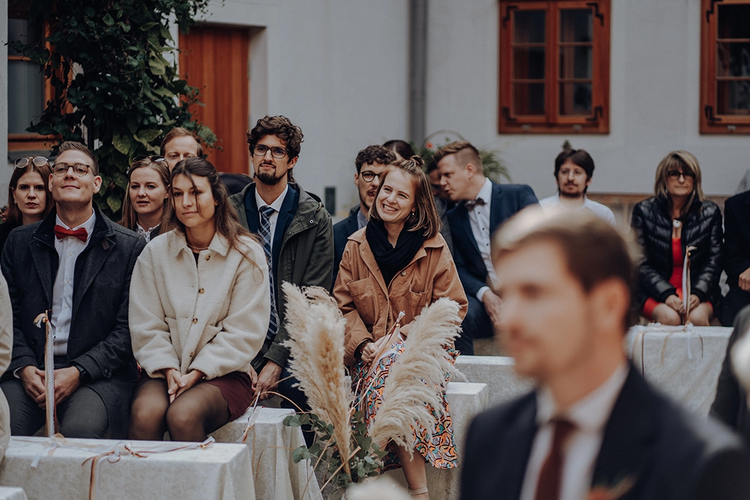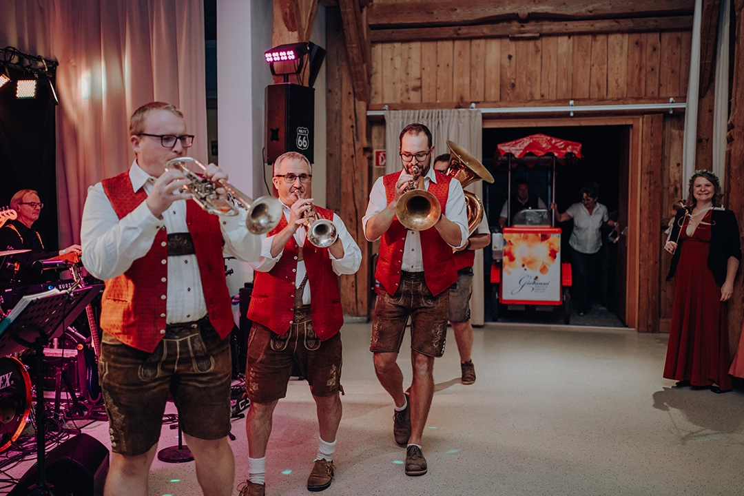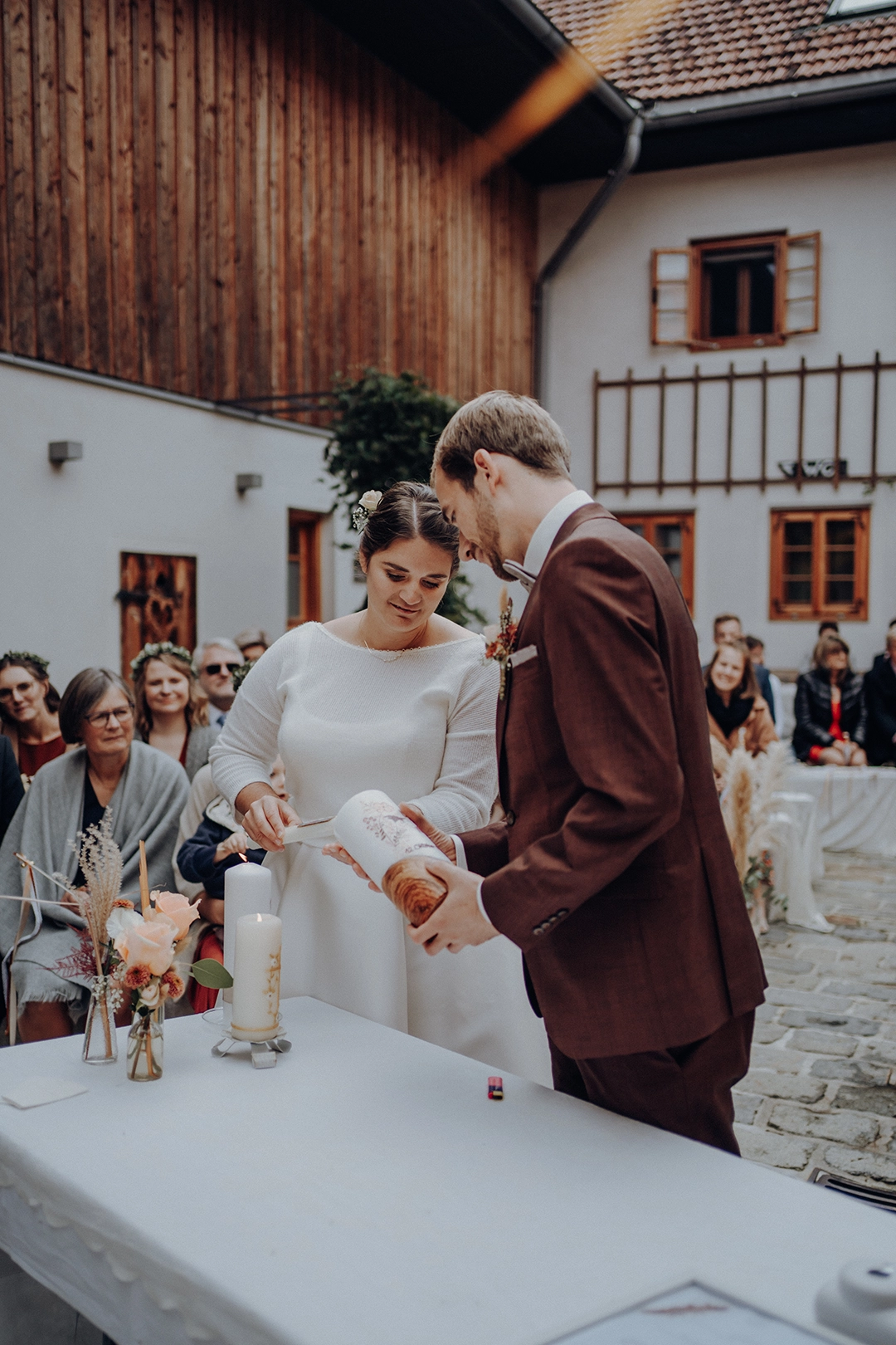 Die Trauung fand unter freiem Himmel im Innenhof des Michlhofs statt – ein Ort, der mit seiner rustikalen, gemütlichen Atmosphäre perfekt zur Stimmung passte. Noch vor Beginn spielten vier Musiker mit Blasinstrumenten ein traditionelles Ständchen für das Brautpaar. Es war ein Moment voller Emotionen und besonders die Braut konnte ihre Tränen nicht zurückhalten. Und auch während der Zeremonie war es ein ständiges Wechselspiel zwischen Emotionen und herzhaftem Lachen. Ein ganz besonderes Highlight war die Ringzeremonie: Die Ringe wurden auf einem Band durch alle Hände der Gäste gereicht, sodass jeder seine persönlichen Wünsche für das Brautpaar mitgeben konnte – eine wunderschöne Tradition voller Bedeutung.