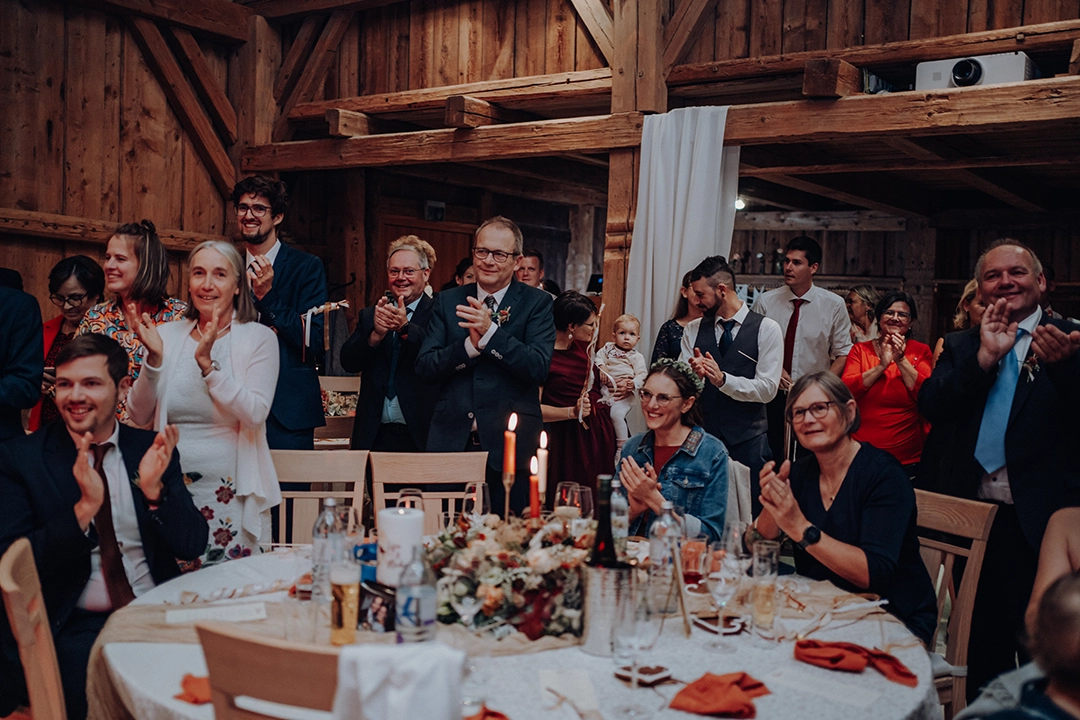 Bevor es zum Feiern in den Saal ging, wurden die Gäste mit einer liebevollen Geste überrascht: Selbstgemachte Lebkuchenherzen mit persönlichen Worten – eine Erinnerung, die garantiert noch lange bleiben wird. Und als die Sonne langsam unterging, nutzten wir die letzten goldenen Minuten für ein paar magische Fotos. Diese Momente im sanften Licht des Herbstabends waren einfach perfekt.